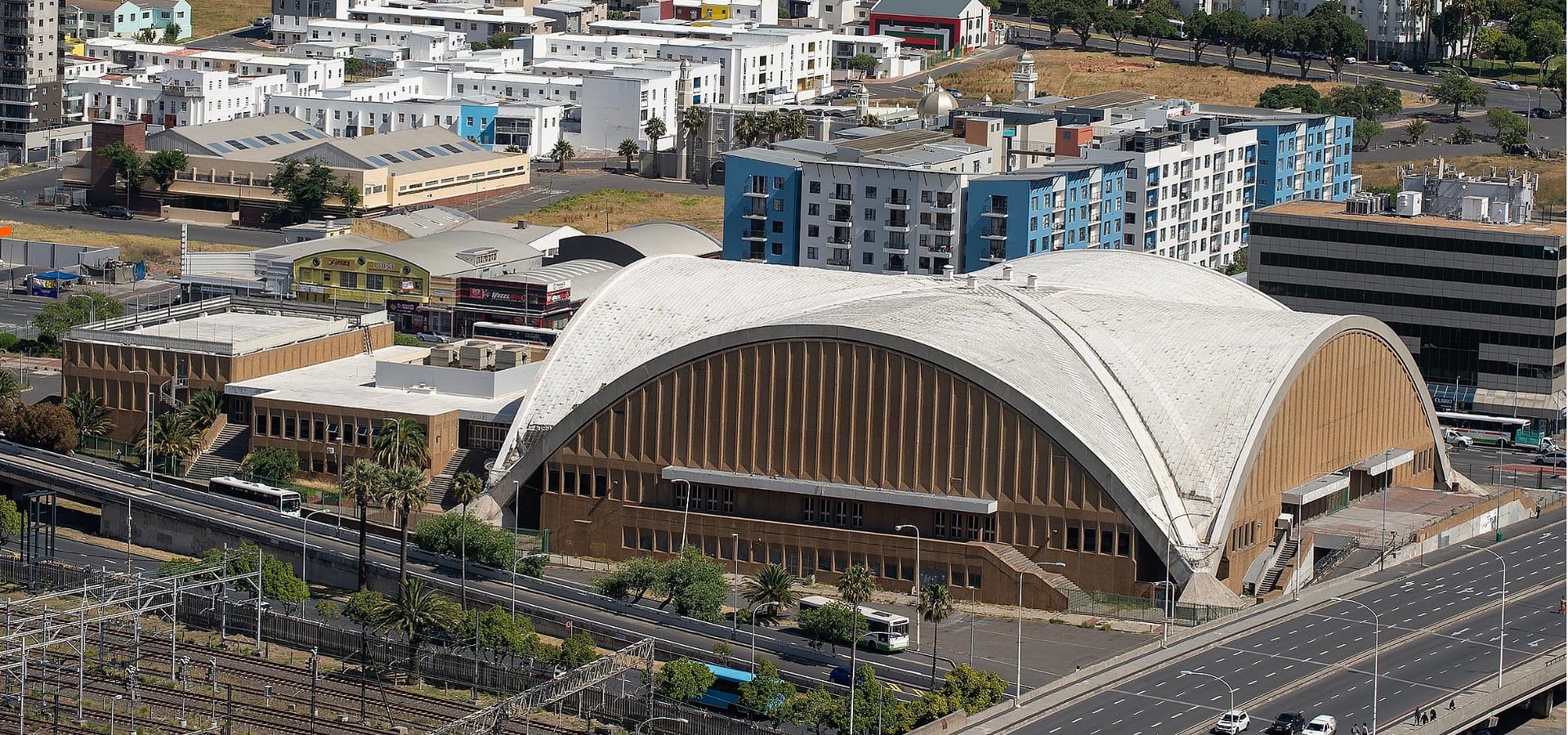 The Good Hope Centre holds historical and architectural significance. It served as a socio-cultural hub during apartheid, hosting numerous public events and competitions, and its structural design marked an engineering milestone, featuring the largest precast concrete roof cross-vault in the world at the time of its construction.